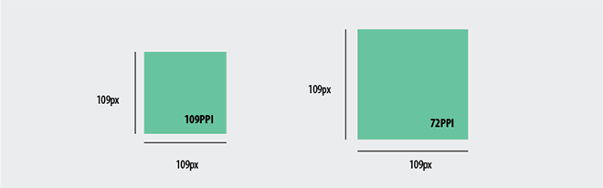 Ennek a négyzetnek a fizikai mérete a képernyőn 1*1 hüvelyk. De ha a felhasználó képernyőjének PPI értéke 72, a kék négyzet ennél nagyobban fog megjelenni. Mivel a PPI 72, a képernyőnek kb. 1,5 hüvelykre lesz szüksége ahhoz, hogy a 109px méretű kék négyzetet megjelenítse. Lásd a hatást a képeken alább: