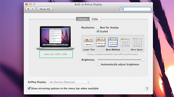 Ezért van az, hogy Retina Macbook Pro esetén, ha meg akarja változtatni a felbontást, megjelenik az alábbi figyelmeztető ablak, miszerint (a lenti képernyőképen) a felbontás 1280*800px –nek “néz ki”. A felhasználó felbontás élményét használja a méretarány kifejezésére.