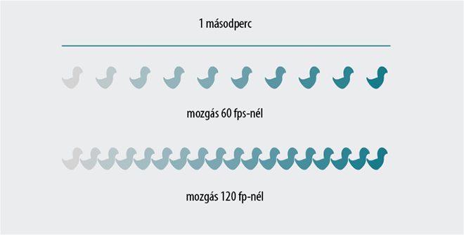 Hogy érthetőbb legyen, nézzük meg az alábbi példát. A dino A pontból B felé halad gyors és azonos sebességgel egy 60Hz és egy 120Hz monitor esetén. A 60fps képernyőn 9 filmkocka jelenik meg az animáció során, míg a 120fps logikusan ennek kétszeresét jeleníti meg ugyanannyi idő alatt. A 120Hz képernyőn az animáció sokkal gördülékenyebb.