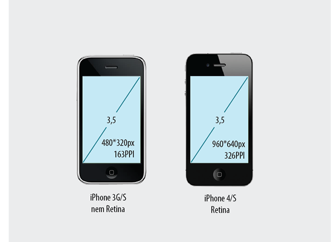 Az iPhone 3G/S 3,5 inch volt átlósan 480*320px felbontással, mely összesen 163PPI.