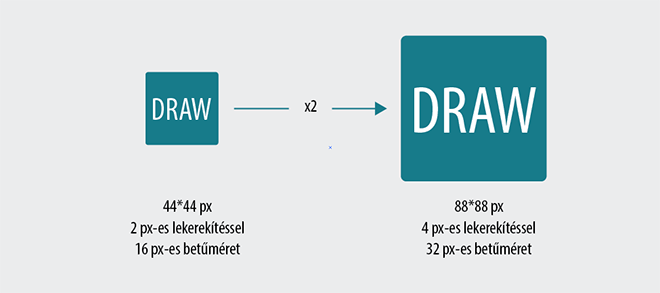 DRAW 44px szélességű normál, nem-retina kijelzőkön, és 88px széles retina kijelzőkön. Most foglaljuk a 20px DRAW-t egy keretbe, mert szereti, ha kényelmesen elfér. Ekkor a keret 40px lesz a retina kijelzőn. De nincs értelme retina pixeleket számolni, ha nem retina kijelzőre tervezünk.