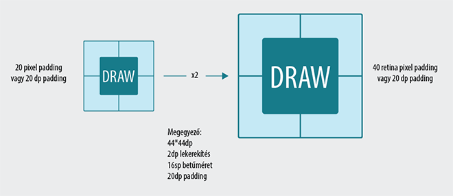 Ebben az esetben DRAW mérete 44*44DP vagy PT a kerete pedig 20DP vagy PT. A specifikáció létrehozható bármilyen PPI-ben, DRAW megjelenése mindenképp 44*44dp vagy pt.
