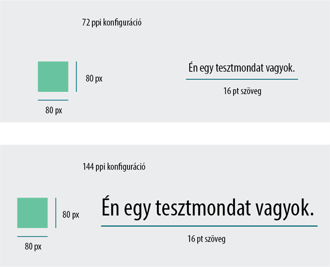 Nézzünk egy példát. Kipróbálhatja egy olyan programmal, mely alkalmaz PPI konfigurációt, például a Photoshoppal. Rajzoltam egy 80*80px négyzetet és egy 16pt méretű szöveget 72PPI konffiguráció mellett. Majd utána ugyanezt 144PPI konfiguráció mellett is.