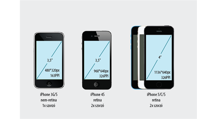 Telefon kategóriában ott a jó öreg 3GS (még az iOS6 is támogatja) és ettől felfele. Csak az iPhone 3GS nem-retina kijelzős. Az iPhone 5-től felfelé a kijelző magasabb, a DPI megegyezik az iPhone 4 és 4s esetén alkalmazottal. Lásd az alábbi puskát: