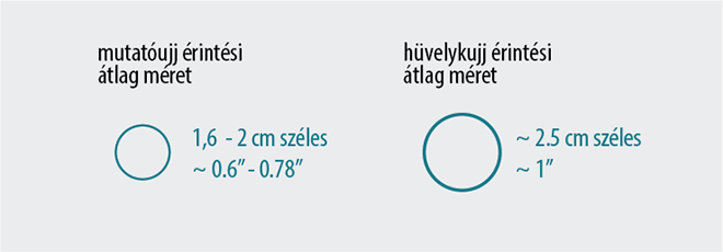 Lássuk az UI interakció során két leggyakrabban használt ujj átlag méretét: a mutató- és a hüvelykujjét. Ez jelenti az érintő zónát is és az ujj által elfoglalt területet is. A valós érintő zóna (vagyis az ujjunk azon része, mely ténylegesen érintkezik a kijelzővel természetesen kisebb és egy fokkal precízebb, kivéve, ha nagyon nekinyomjuk az ujjunkat a képernyőnek.