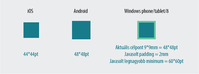 Látható, hogy minden OS más javasolt értékkel dolgozik, de mindegyik 48pt körül van. A Windows a kitöltést is megadja a specifikációban, ezért írtam ide.